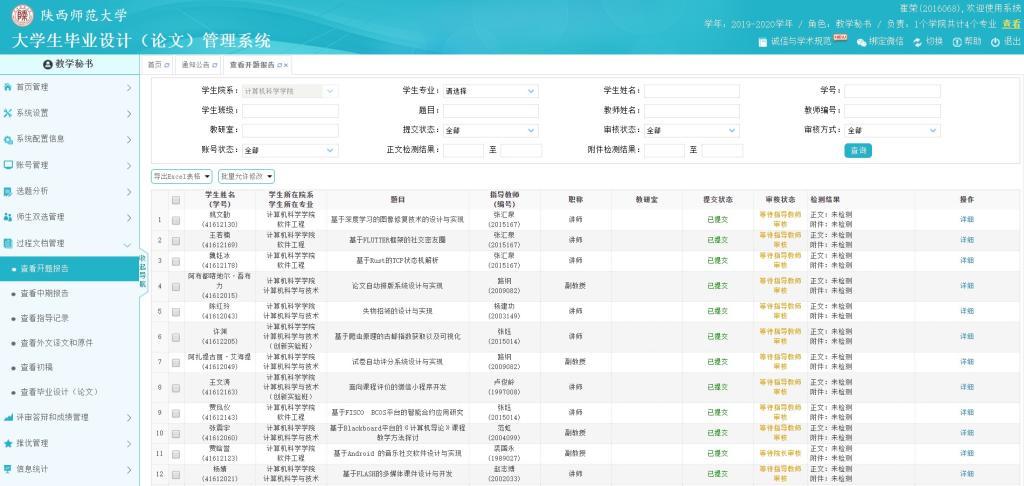学院结合前期毕业论文(设计)工作安排及实际情况,核实学生毕业论文的进度及面临的问题,完成毕业论文选题变更情况的核定。学院今年首次试用“中国知网”大学生毕业设计(论文)管理系统,现已完成题目双选、选题变更、开题报告等环节,该系统的使用,大大提高了工作效率,实时监测导师指导和学生完成的情况,以督促尚未及时完成的学生。接下来学院将着手其他过程文档的收集、毕业答辩安排等后续工作,加强过程监管,保障毕业设计总体质量。
