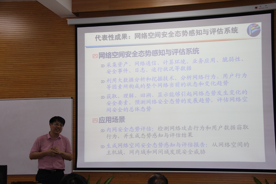 报告中,吴槟副研究员用幽默风趣的语言为我们介绍了当前大数据背景下所面临的一系列信息安全问题,并对其研究团队在网络攻防实战推演沙盘、网络安全工具教学实训平台、面向重要信息系统的渗透测试、隐蔽通信检测系统、视频设备搜索与发现引擎、Web异常行为发现与取证分析、基于社会媒体数据的人物关系网分析、网络空间安全态势感知与评估系统等方面所做的工作做了详细介绍,最后针对如何评估网络空间安全,他指出我们可以利用大数据分析和挖掘技术,分析网络行为、用户行为等安全因素去预测网络安全态势的发展趋势,以此来评估网络空间安全的总体态势。