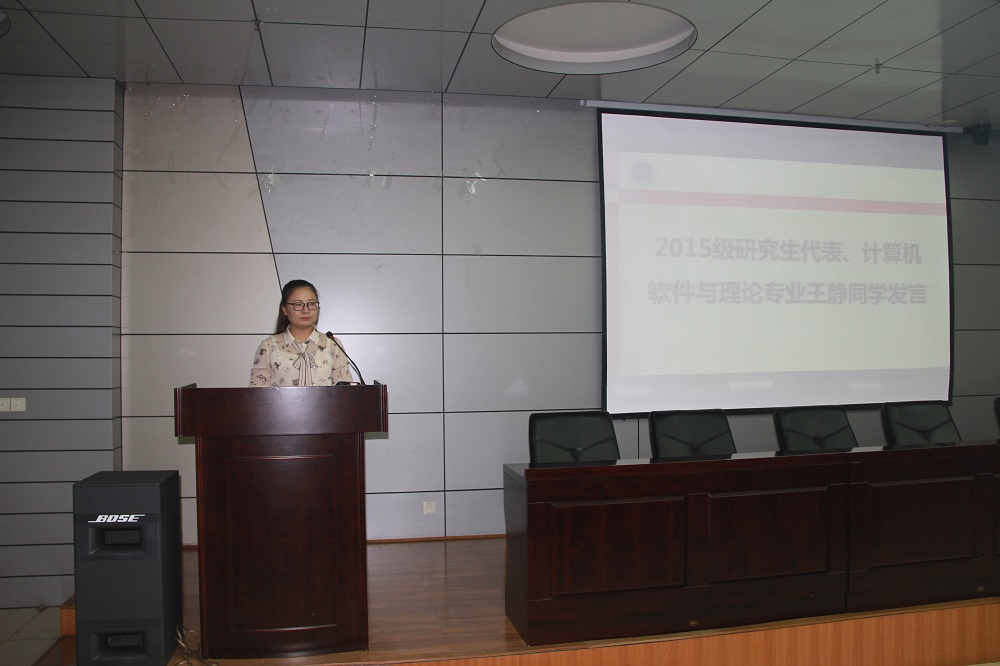 高年级学生代表、2015级计算机软件与理论专业研究生王静结合自身经历分享了自己对研究生生活的感想,并对新生提出“一个目标、两个热情、三个美好”的希望和祝愿,即对新生活建立新的目标,对科研和生活的热情,学术成果收获的美好、综合实力提高的美好、计算机科学学院的未来充满美好。
