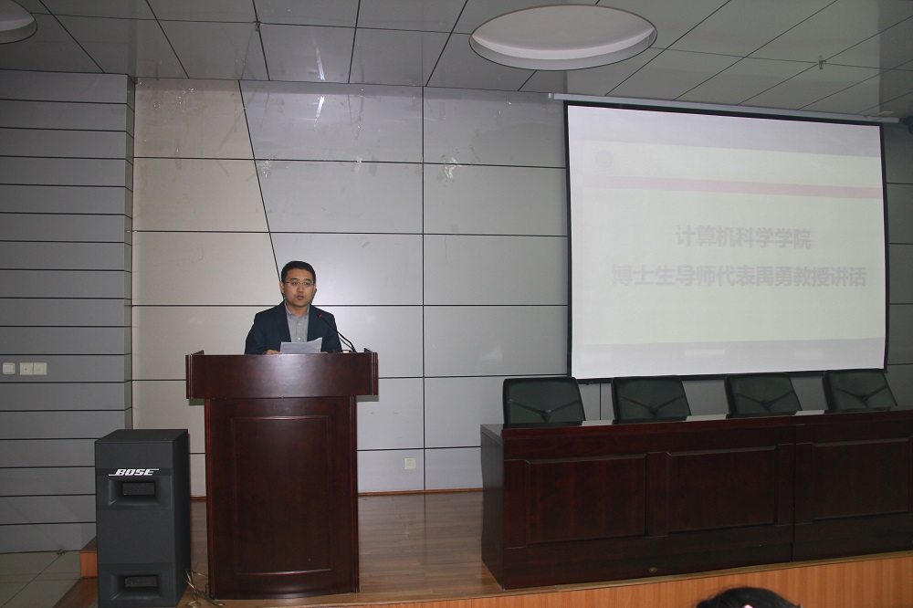 禹勇教授代表研究生导师发言。他用幽默诙谐的语言就如何完成学业提出四点建议:一要做好角色改变,研究生的学习不同于本科,学术研究需要创新;二要掌握适合自己的科研方法,将所学的知识内化成观察、思考、分析和解决问题的相关方法;三要做顶天立地的科研,顶天是指做基础研究要面向学术前沿,在国际顶级期刊或会议上发表论文,立地是指做应用研究要能解决面向国民经济或者国家重大需求的实际问题;四要安排好自己的生活,积极锻炼身体,保持规律的生活,注重劳逸结合,多向优秀的人学习。