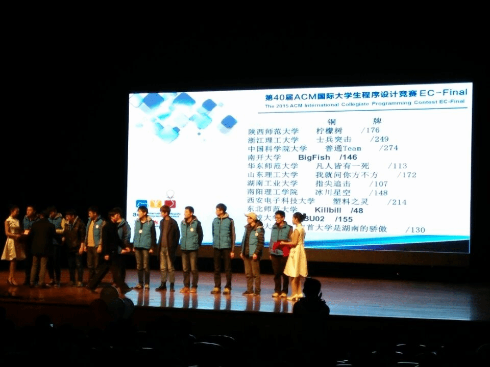 11月12日至13日,2015年ACM国际大学生程序设计竞赛东亚地区总决赛(EC-Final)在上海大学举行,比赛吸引了来自朝鲜金策工业综合大学以及中国大陆清华大学、北京大学、上海交通大学等135所高校学生组成的290支代表队参加。在学校和计算机科学学院各级领导的关怀和支持下,由计算机科学学院王涛老师指导的我校ACM竞赛队经过刻苦集训和紧张备战,共派出由9人组成的3支队伍参加了本次比赛。