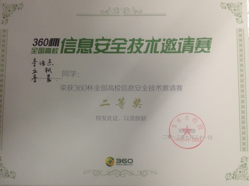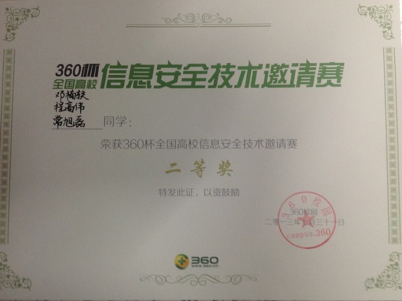 为进一步深化高等学校的素质教育,促进学生对网络与信息安全知识的了解,激发学生学习网络与信息安全技术的积极性,培养学生的创新意识、协作精神,提高学生应用网络与信息安全知识解决实际问题的能力,第一届360杯全国高校信息安全技术邀请赛于2013年7月30至31日成都信息工程学院举行。比赛分为三个环节:第一个环节为在线基础测试;第二个环节为现场理论答题、在线实践答题和在线综合测试题;第三个环节为现场网络对抗。竞赛考查知识点包括网络基础、移动应用开发、Web安全、逆向工程、操作系统安全与信息安全相关的知识等。