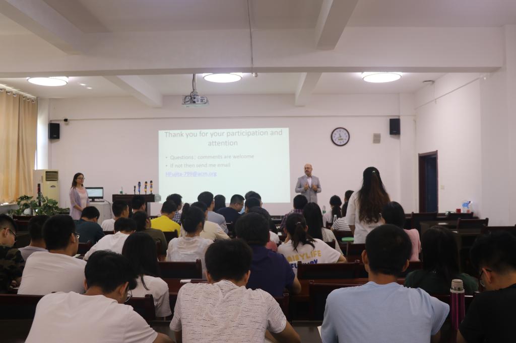 在报告中,Fujita教授首先分析了基于大数据云的卫生保健领域面临的挑战,如数据维度高、数据复杂难以处理等问题,粒计算和特征选择研究的挑战等。其次,Fujita教授借助一个健康风险预测项目,介绍了其团队提出的通过在线集成学习方法可获取到更加全面的特征信息的新方法,并为大家展示和介绍了其在医疗风险预测方面研究的成果及一系列基于云的健康风险预测项目。最后,部分师生结合自身研究领域的相关问题与 Fujita教授进行了交流与探讨。