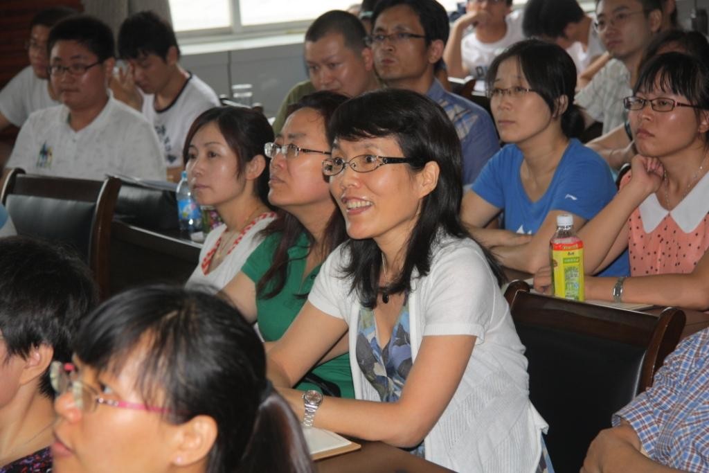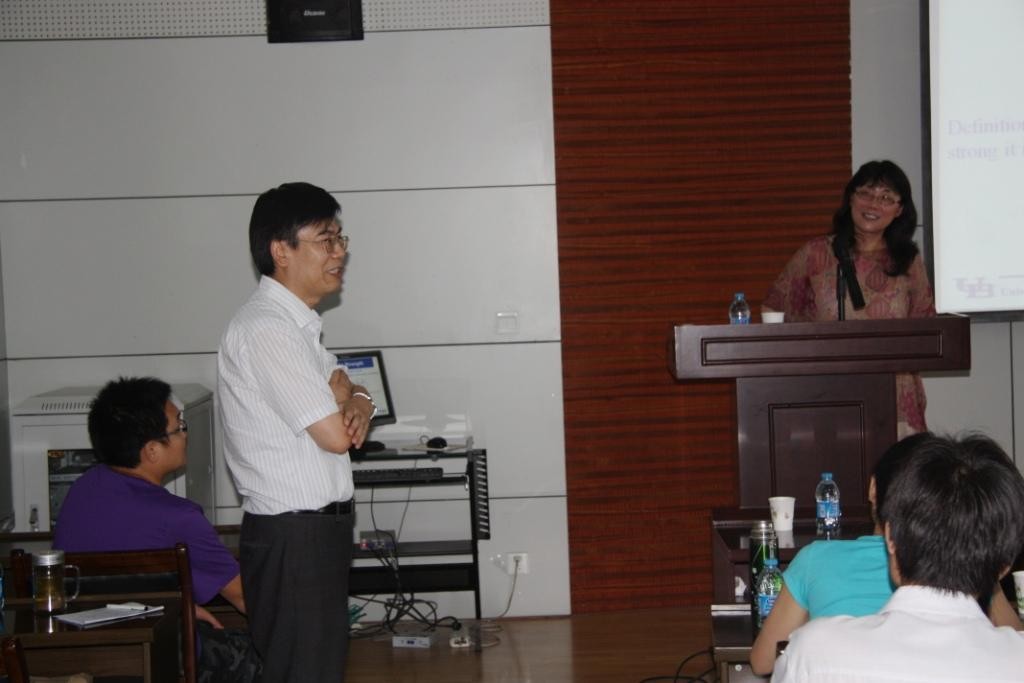 所有师生向张教授的到来表示热烈的欢迎。报告中,张教授首先讲述了为什么社会网络、蛋白质相互作用(PPI) 网络要使用基于图的模型以及其上的数据挖掘方法。接着提出了目前此类网络研究中的两大挑战:一是如何从网络中提取对象的作用,二是如何将网络的动态特性整 合到所提出的模型中。之后阐述了动态网络的模型构建以及靶标分析与预测框架。在阐述了功能流方法后,给出了模块强度的概念、量度以及推演。最后结合基因表 达和PPI网络的研究,描述了构建动态网络的方法。