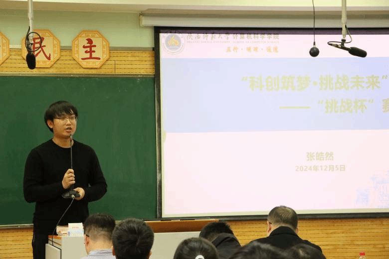 张皓然结合自身参赛经历介绍了“挑战杯”竞赛的相关信息,讲解了“大挑”与“小挑”的区别、竞赛发展的趋势、赛段等相关情况。他向同学们分享了参赛经验,指出注重细节与团队协作的重要性,鼓舞同学们踊跃参加,在比赛的锻炼中不断突破困难、提高自我。