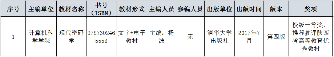 杨波教授主编的《现代密码学》(第四版)教材在此次参评中荣获校级一等奖,并被推荐参加省级优秀教材评选。