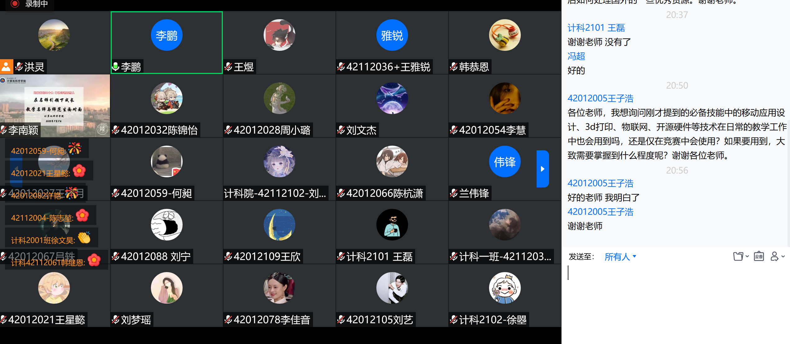 王煜老师首先向大家介绍了她和信息技术课程的一些故事,着重介绍了高中信息技术课程在新课标改革下如何进行教学创新,从跨学科融合、单元教学设计、项目学习、混合式教学等方面介绍了个人的教学改革经验,并向同学们展示了信息技术与物理学科融合的一个实际课例,为同学们指明了教学创新的方向。冯超老师从选择、方向、问题三个方面,建议同学们在上学阶段要多多学习先进的教学理论与方法,多多关注所在学科的新技术。她特别强调了编程语言在信息技术学科竞赛中的重要性,鼓励同学们在练好教学基本功的同时,多关注学科的相关政策与竞赛信息,发展个人特长。李南颖老师从职业理想、国家的教育理念改革、扎实的学识、个人素质发展四方面出发,建议师范生要有职业认同感、学会自主学习、掌握更多技能、还要关注多学科融合,博览群书提高个人素质。韩恭恩老师从自身的职业发展出发,跟同学们分享了其成长为优秀信息技术教师(尤其在机器人竞赛方面)的经历,并鼓励同学们要不负韶华、抓好主职,根据自己的特色,坚持不懈,找到事业发展的突破点!