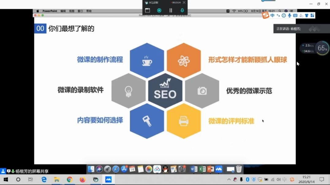 讲座开始,为了让同学们认识“微课”,杨楷芳老师深入浅出地分析现代社会知识“碎片化”的现象,引出“微课”概念。随后,总结概括了“微课”的特点,并针对“微课”的特点进行分类。杨老师详细讲解了“微课”的制作流程,细节划分制作过程中的各个步骤,完备展示了“微课”的细节,对 “微课”制作的重难点——创新型微课制作做出解释。针对同学们的疑惑如:怎样选择“微课内容”,怎样制作吸引人的“微课”,杨老师一一做出解答。最后,通过播放优秀“微课”视频作品,加深了同学们对“微课”的认识及其短小精悍的特点的理解。