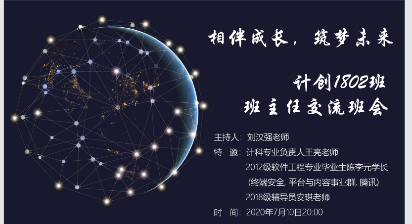 计创1802班于7月10日下午20:00召开主题为“相伴成长,筑梦未来”的线上班主任交流会。此次交流会由计创1802班班主任刘汉强主持,计算机科学与技术(创新实验班)专业负责人王亮、2018级辅导员安琪、2016届软件工程专业毕业生陈李元以及计创1802班全体同学参与此次班会。