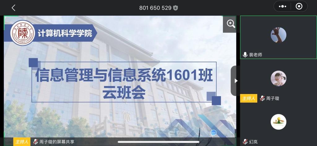 为了加强学生对于疫情防控工作的重视,防止同学们因为疫情的缓和而放松警惕,纠正学生有关于防疫的具体方法,切实加强学生的思想教育和价值引领,信息管理与信息系统1601班6月23日晚在“腾讯会议”召开了“云”班会,信管1601班班主任裴炤、辅导员郭康凌以及本班全体学生参加了班会,班会由裴老师主持。