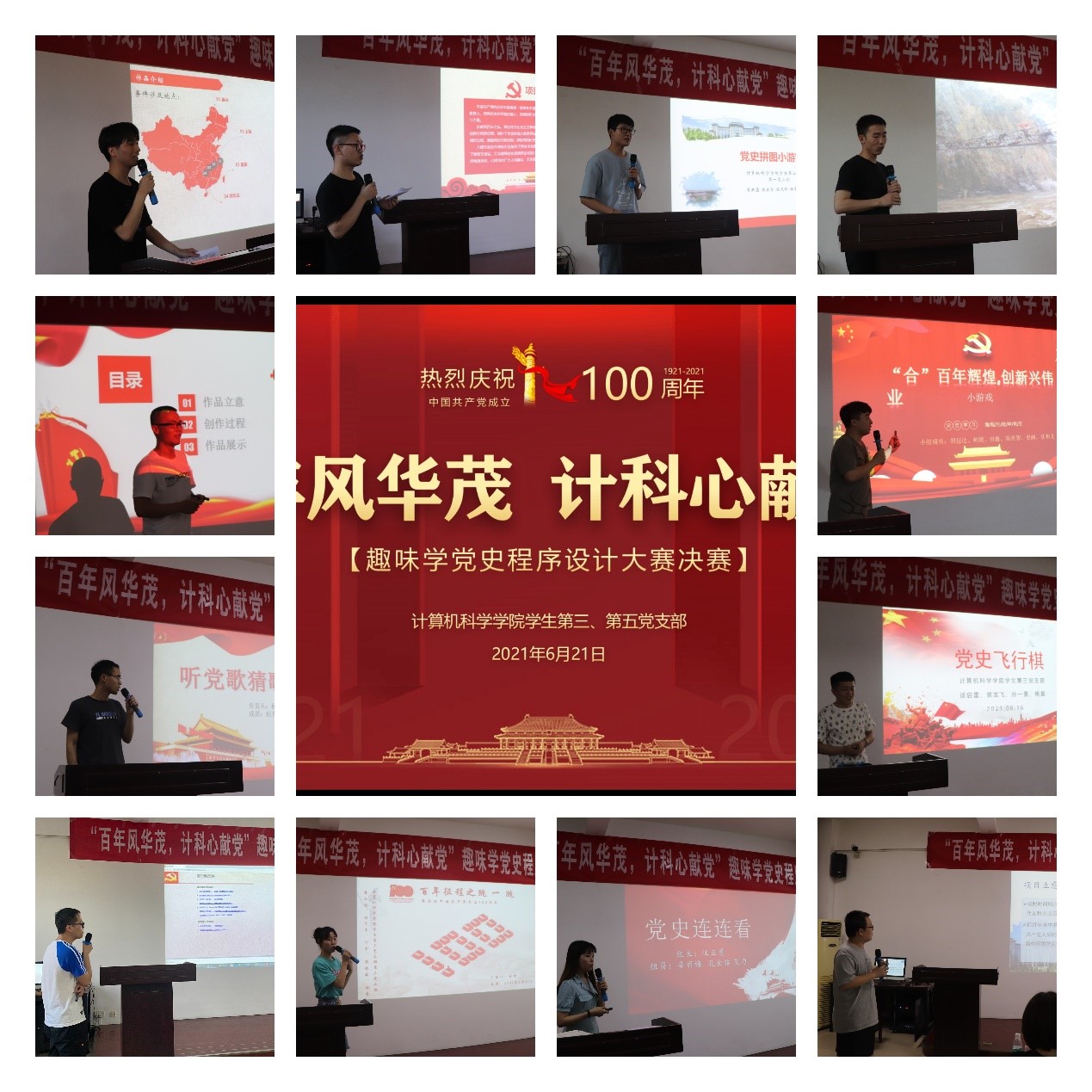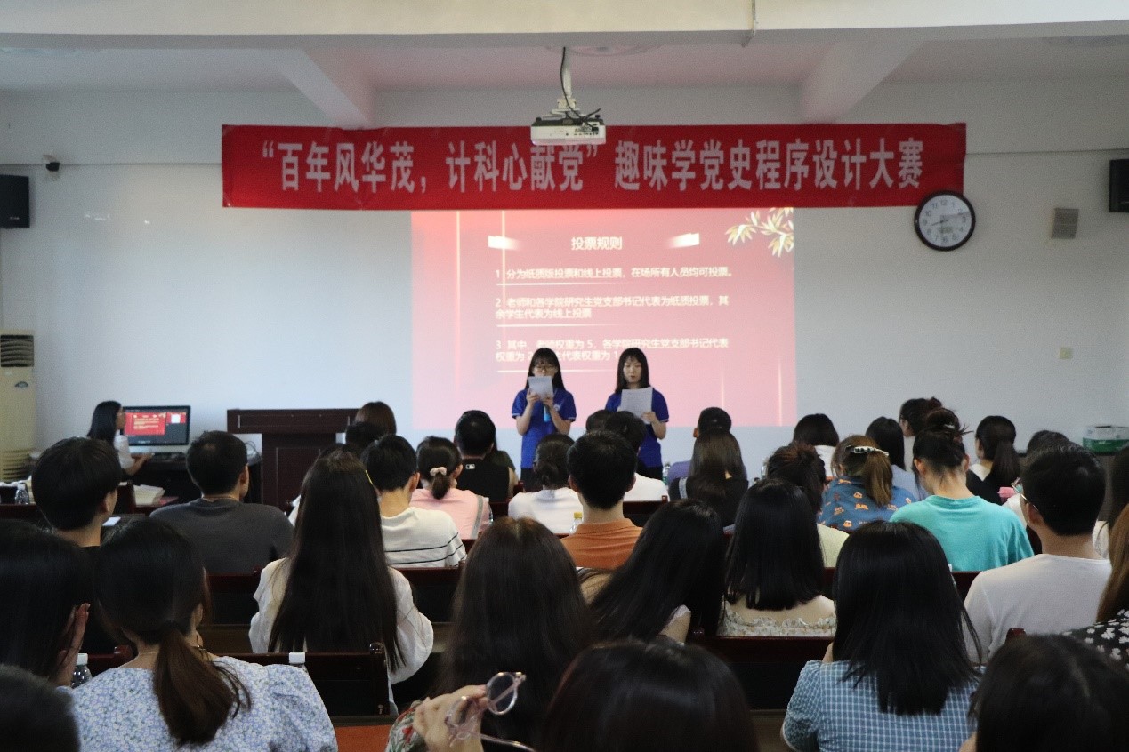 学生第三、第五党支部于2021年6月21日晚在文津楼3412室学院报告厅成功举办“百年风华茂 计科心献党”趣味学党史程序设计大赛决赛。本次活动由支部书记任仰、禹棋洺同志主持,学院党委书记王耀明、研究生辅导员蒋江红、研工部杨雅程老师及各学院研究生党支部书记代表等作为评委参加活动。