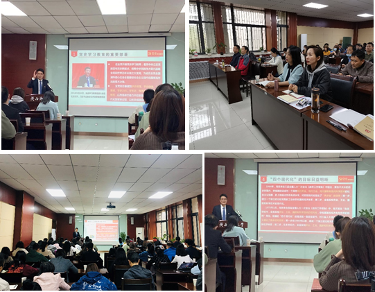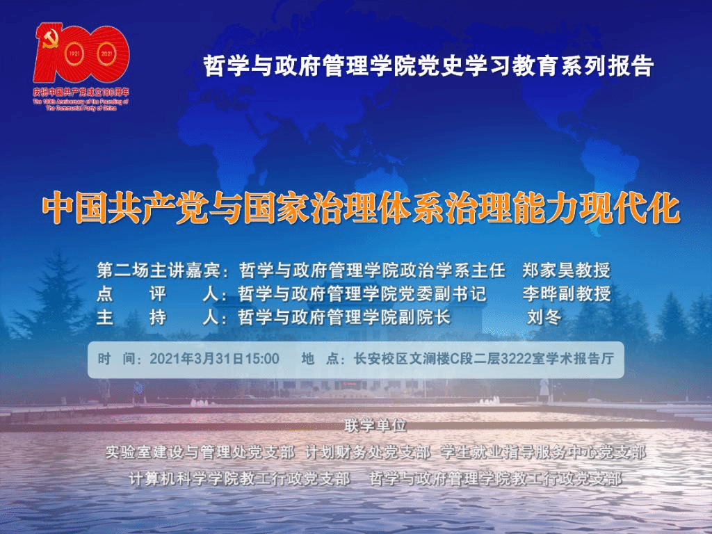 教工行政党支部与实验室建设与管理处党支部、计划财务处党支部、学生就业指导服务中心党支部、哲学与政府管理学院教工行政党支部以及师生党员代表80余人,共同聆听了我校党史学习教育教授宣讲团成员郑家昊教授作的题为《中国共产党与国家治理体系治理能力现代化》党史学习教育报告。