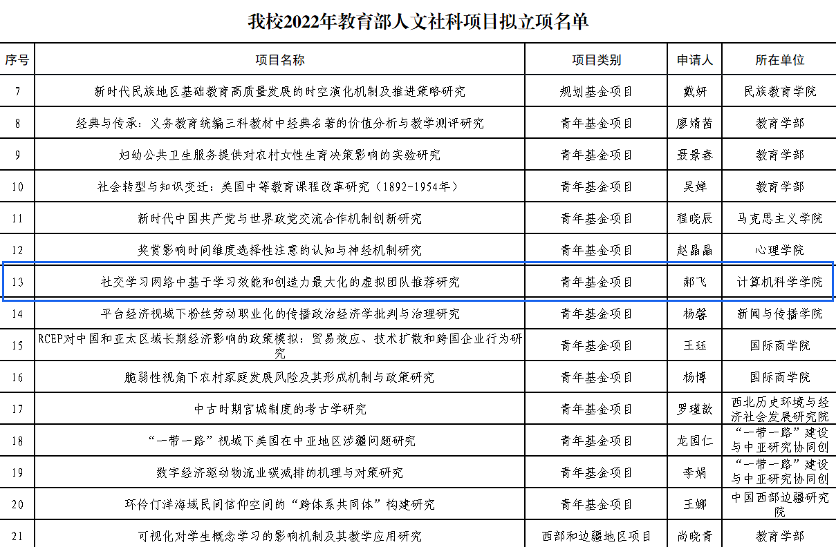 2022年度教育部人文社科基金项目我校共有30项项目获批立项,立项数位居西北首位、全国并列第五。