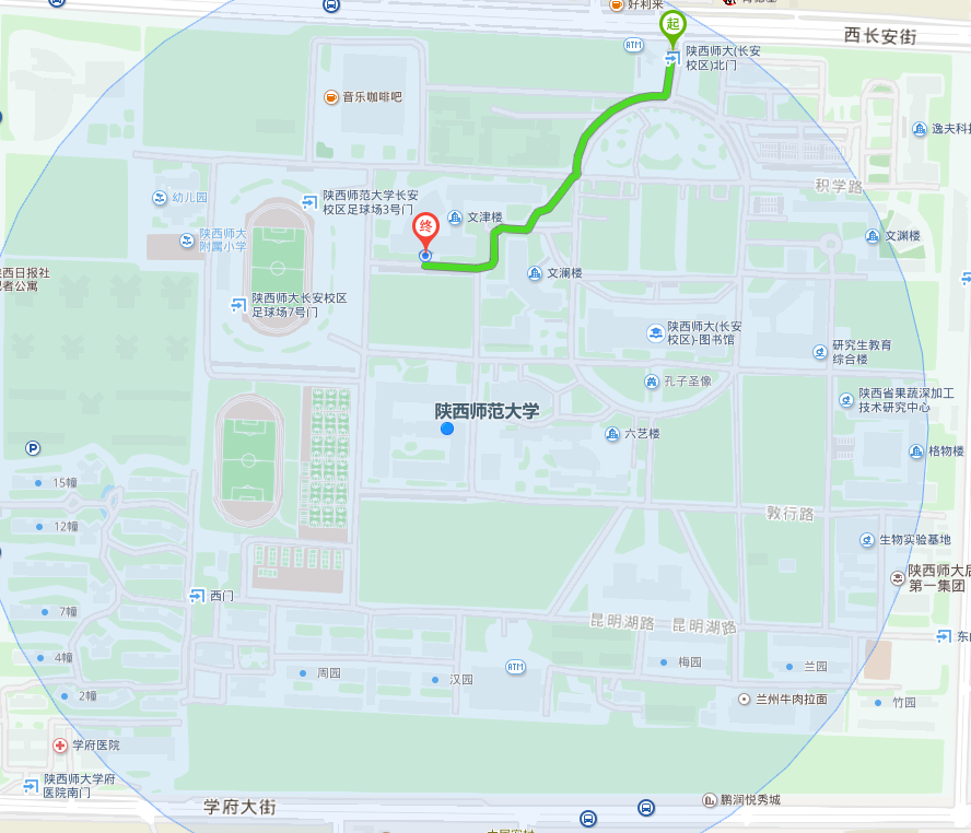 从陕西师大(长安校区)北门向正南方向出发,走60米,右转进入书山道,沿书山道走170米,右转进入积学路,沿积学路走10米,离开积学路,向左前方转,走130米,右转穿过马路继续向前,走10米,向左前方转,走60米,右转,走70米,到达肉漫画