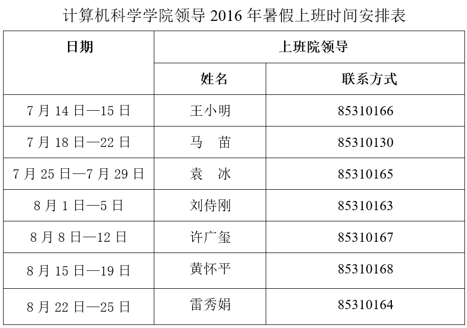 附件:计算机科学学院2016年暑假上班人员和时间安排