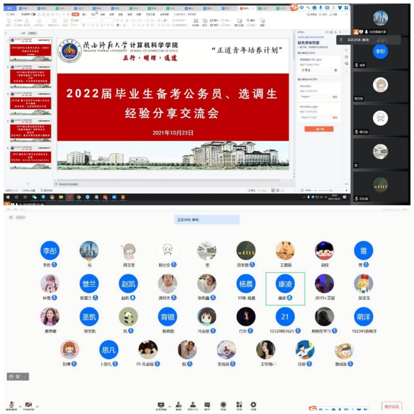 2022届毕业生对公务员、选调生政策的了解,帮助同学们做好备考、就业相关准备,10月23日晚,我院通过腾讯会议形式举办“正道青年培养计划”之2022届毕业生备考公务员、选调生经验分享交流会。学院4位考取了公务员、选调生的优秀校友分享备考经验,毕业班辅导员田海东、2022届意向公考的本科生、研究生,学院其他低年级有意向了解公考相关情况的同学参加会议。会议由学院党委副书记郭康凌主持。