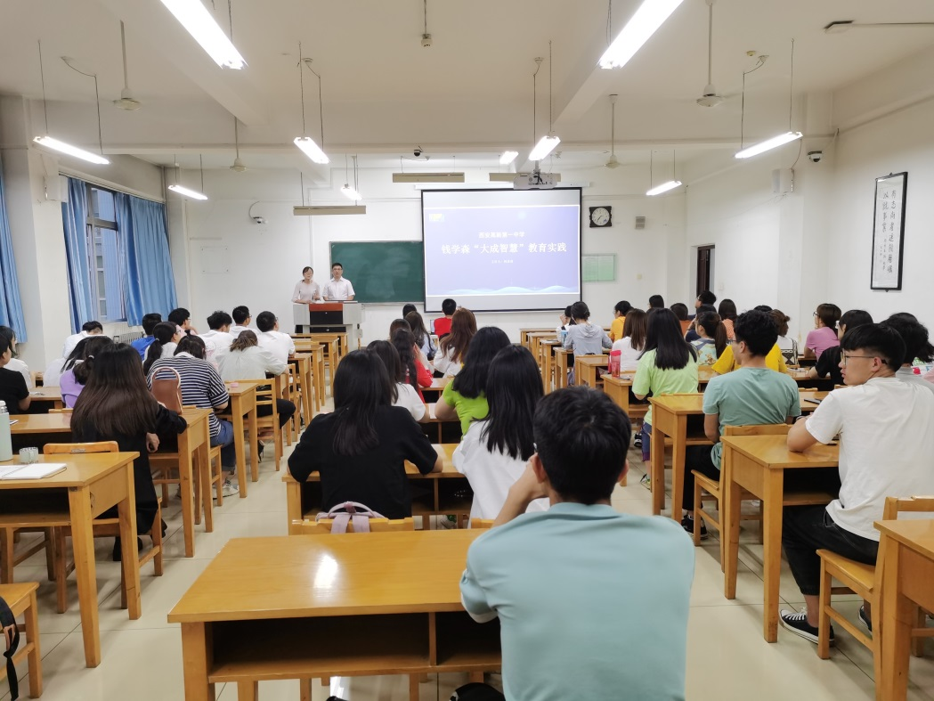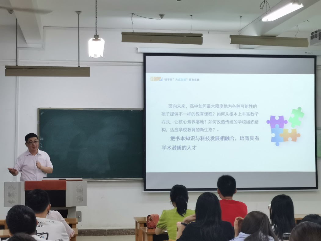 韩恭恩以钱学森“大成智慧”教育实践为主线,结合个人在西安市高新第一中学十九年的实际教学经验,重点讲解了在高中教学中如何建设类型多样的课程,如何丰富教学方式、培养核心素养,改造传统组织结构、适应学校教育新生态等问题。他分享了西安市高新第一中学联合教育、科研、资本三方力量,强化校企合作,设计思维课堂,开展启发教学,探索培养科技创新人才的新方法,展示了学校组织学生主动探索、动手创作的成果,为师范生提供了在未来教师岗位上的众多发展方向。
