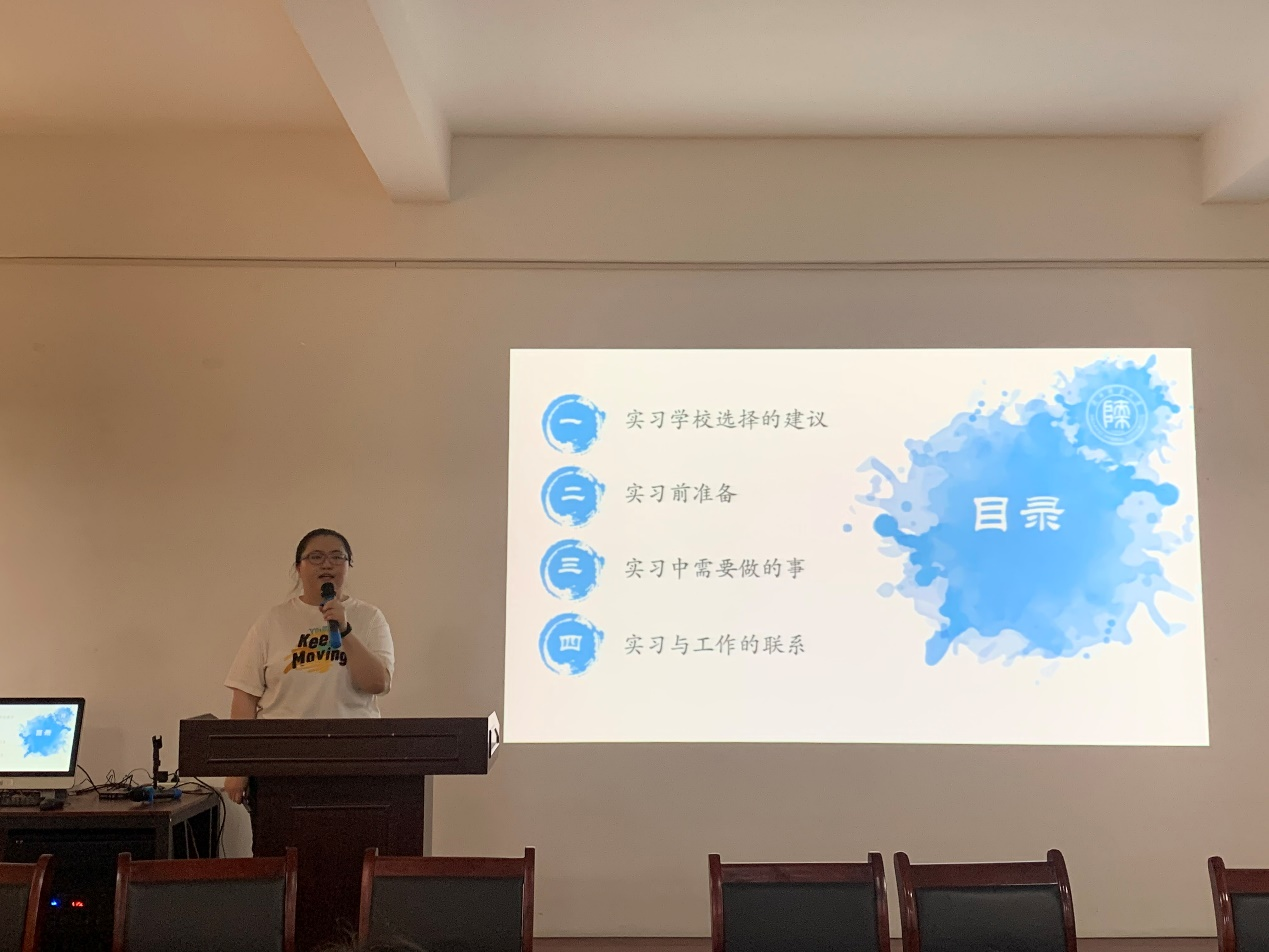 于5月10日14:30在文津楼3412教室开展了以“高年级实习和就业准备工作分享”为主题的大学生就业指导课。此次课程邀请了2017级公费师范生甘毓琪、陈慧洁与何胤莹三位学姐进行分享,学院党委副书记袁冰及2018级全体公费师范生参加了此次课程,课程由2018级本科生辅导员安琪主持。