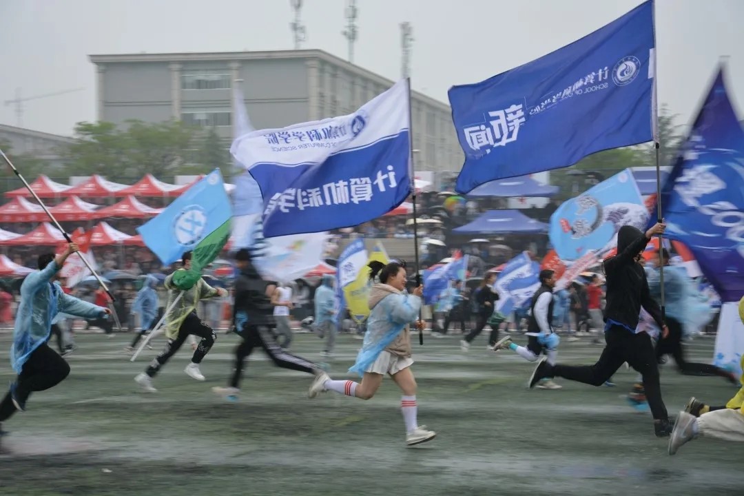 学生代表及教职工组成的方队迈着矫健的步伐走向主席台,旗手们高举着象征着理性的蓝色院旗,他们目光如炬,斗志昂扬。紧随其后的是两个憨态可掬的卡通机器人。教师们手举院牌,他们博学睿智,严谨治学,为学生的梦想指引方向。最后,我们迎来的是学生方阵,他们步伐整齐,展现出了计科人朝气蓬勃的精神面貌。开幕式上,卓越体能表演整齐划一,太极拳表演刚柔并济,啦啦操表演青春洋溢。
