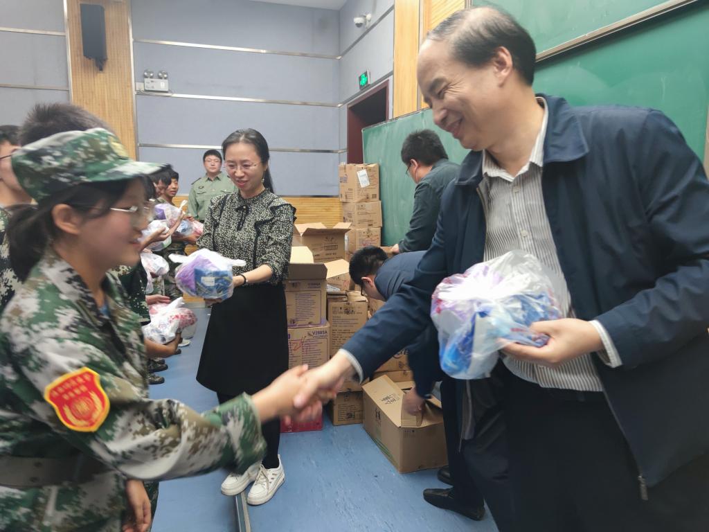 随后,黄书记和各位老师亲自将一份份爱心礼物送到同学们的手中。本次慰问舒缓了同学们紧张的训练生活,同时让同学们感受到了学院的关怀和温暖。相信在接下来的军事训练中,同学们会继续发扬不怕苦不怕累的精神,以顽强拼搏的意志上好大学的第一课。