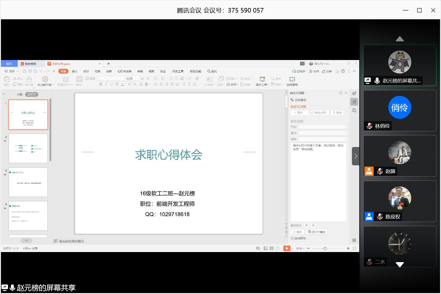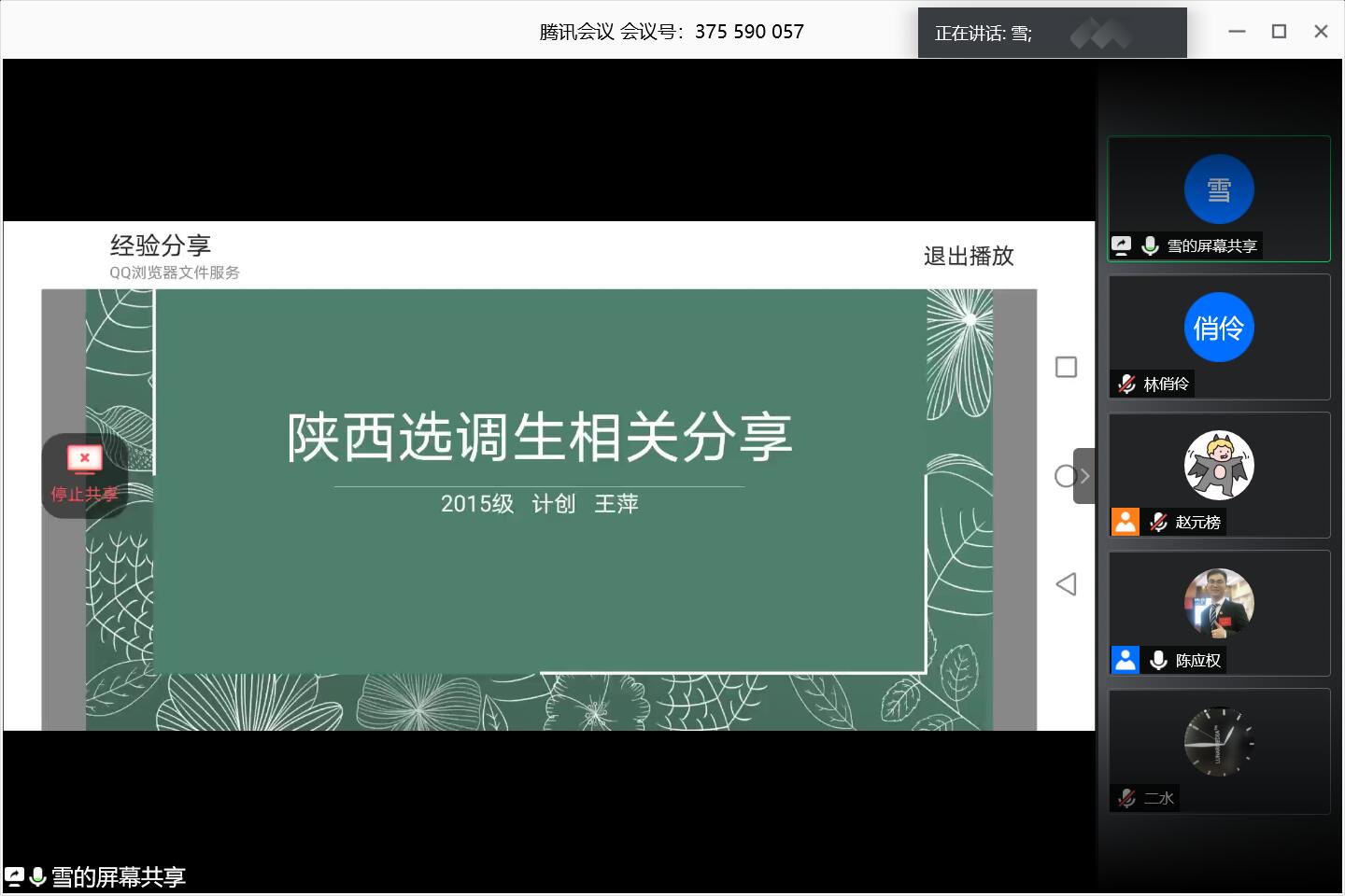 举办了2021届本科生就业经验线上分享会。本次分享会邀请到15级王萍,16级赵旗、赵元榜等三位学长学姐为2021届本科生分享各自的求职经验,17级的张园园同学向大家分享了自己寻找实习单位的经历。学院党委副书记袁冰、2021届全体本科生参加了本次分享会,分享会由辅导员陈应权主持。