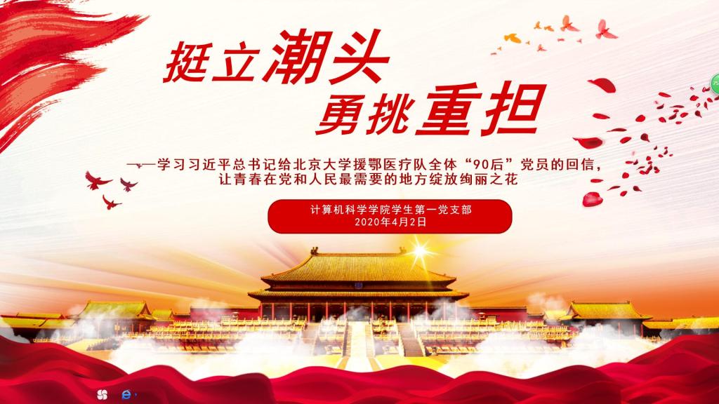 首先,在孙乐晴同志的带领下,全体党员学习了习近平总书记给北京大学援鄂医疗队全体“90后”党员的回信内容,并通过一段视频资料一起回顾了众多“90后”党员在此次抗疫过程中的使命与担当。