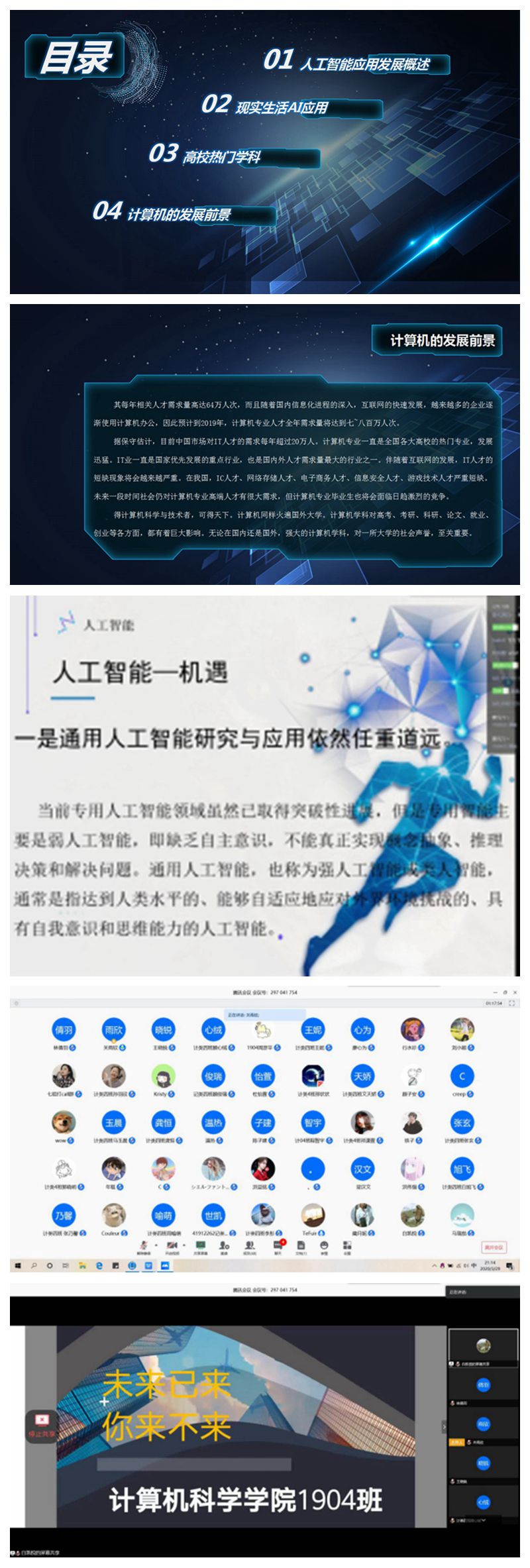 各班级班会形式多样,内容丰富。班委准备了精美的ppt和视频,通过视频播放的形式向同学们直观展示了人工智能的现状与未来发展方向,分别就AI技术的新特征、AI的认知计算、AI 3.0这三个方面展开介绍,通过多方位的视角介绍人工智能未来的前景。计科1901和计科1902班的同学纷纷表示,作为一名师范生,他们一定努力学好专业知识,未来走上讲台将计算机专业的魅力展现给更多的学生。计类班级的同学在班委的引导下,学习了《人工智能安全标准化白皮书(2019版)》等内容,同学们表示计算机专业未来有很大的前景。它将深刻影响甚至改变人们的生活方式,为生活带来极大的便捷,非常荣幸自己能成为这个专业的一员。