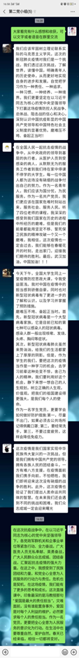 在听完“疫情防控思政大课”之后,学生第五支部迅速组织党员同志展开在线交流,通过群语音的方式谈一谈自己听课后的感想以及在此次疫情当中的真实感受。支部的每一个人都谈了自己的体会,从大家的发言中可以发现,大家感触最深的就是第四位教授讲的关于青年的责任担当与使命。