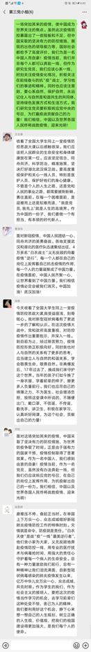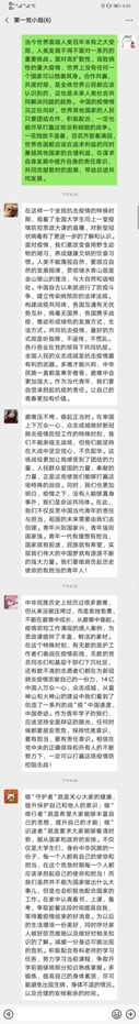 这堂思政课,坚定了我们打赢这场疫情防控人民战争、总体战、阻击战的信心和决心,深刻认识到中国抗疫彰显的中国共产党领导和中国特色社会主义制度的显著优势。我们要学习奋战在疫情防控一线的英雄们的精神,不忘初心、牢记使命,学好知识本领,承担青春责任,为建设祖国奉献我们的青春和力量。