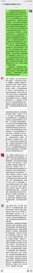 学生第四党支部全体党员在线观看了“全国大学生同上一堂疫情防控思政大课”。课后,支部党员围绕专家讲授,结合自己的亲身经历和假期见闻,以党小组为单位展开热烈的线上讨论。党员在党小组内,以群语音或文字形式,畅谈对本次抗“疫”战斗的思考和感悟,分享思政课中最有触动和启发的点。党员纷纷表示,这堂思政课内容丰富,触动心灵,让人受益匪浅。