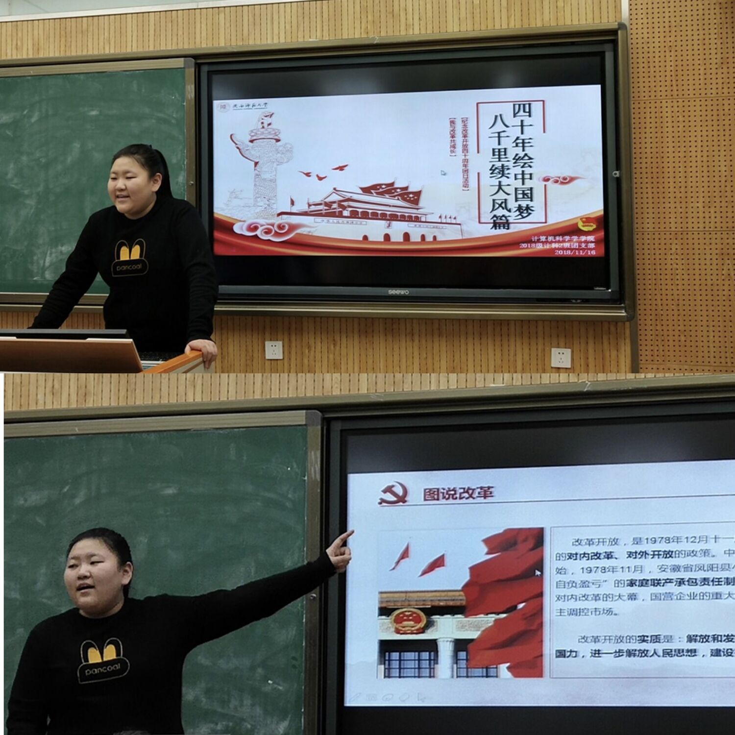 本次团日活动由2018级计科二班团支书蒋山主持。活动开始,蒋山先为同学们介绍了改革开放的历史,使同学们认识到改革开放的实质:解放和发展社会生产力,提高综合国力,进一步解放人民思想,建设有中国特色的社会主义。