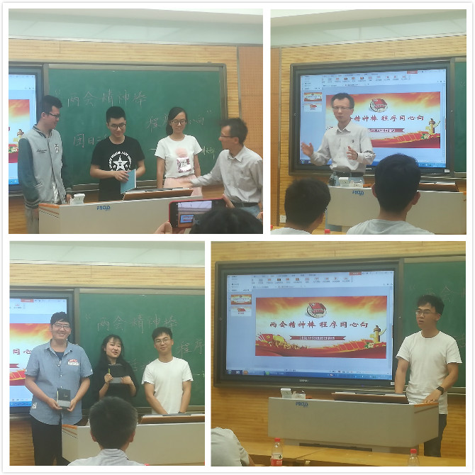本次团日活动分为创意组和编程组两大类。编程组由每个学习小组内部推选一个程序参加比赛,一共8个小组。创意组由同学个人自愿报名,共有两组参赛。活动开始时,团支书赵怡杰同学简单为我们介绍了两会的相关内容以及比赛流程和规则。随后,编程组同学按照提前选好的顺序依次上台分享自己的小程序。张文博、何一凡介绍的两会知识小游戏极大得激起了大家的兴趣,也让我们对学习计算机再次燃起了激情。文根峰、邓乐涛为我们讲解了许多关于编程的小知识,让我们对自己学习的专业有了更全面的认识。除此之外,吴佳贞、曹煦、杨克敏也为我们带来了极其精彩的分享。