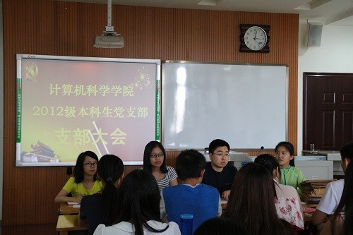2015年6月8日下午,计算机科学学院2012级本科生党支部于文津楼召开了党支部大会。参加本次大会的有正式党员13人,预备党员26人及预备党员发展对象19人。会议由党支部书记张冲老师主持,主要讨论殷亚茹等8名同志的转正申请及范俊怡等19名同志的入党申请。