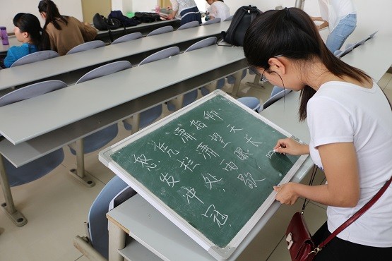 比赛现场,在观看了同学们的书写作品后,胡雯洁老师和张冲老师对参赛同学的书写进行了点评,指出其优点和提出了相应的改进建议。最终,从参赛选手中挑选出了7位同学参加总决赛。比赛后,张冲老师对总结赛的相关事宜进行了安排。张老师指出,总决赛将会有个人挑战赛环节,为没有被选入参加总结赛的同学提供了一个机会,希望大家平时多加练习,在总结赛中拿出更好的。同学们在比赛现场相互交流经验,促进大家板书能力的提高。