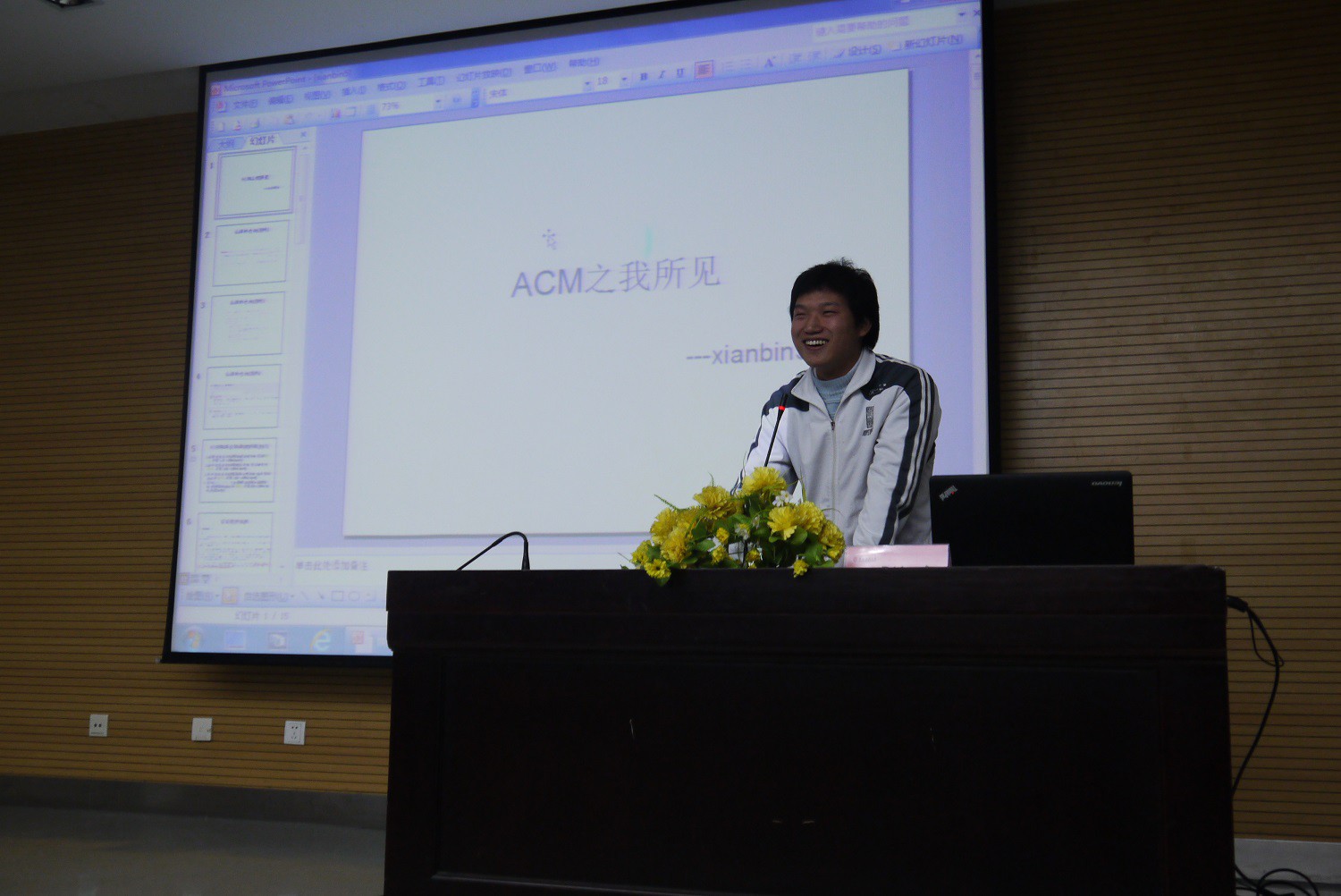 随后,学院研究生欧阳显斌与在场同学分享了他的ACM竞赛之路。欧阳同学言语幽默且充满自信,处处流露出对ACM这项赛事浓厚的兴趣和深深的热爱,他也用自己身边的实例向大家展示了参加ACM比赛对个人能力培养和发展带来的好处。他与在座同学分享的人生信条:“大半失败者是因为快成功的时候放弃了。想成功就要坚持!”赢得了全场的喝彩。
