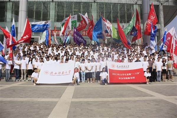 2013年暑期社会实践骨干团队在团委书记胡雯洁老师的带领下,在钟南音乐厅广场前参加了我校暑期社会实践出征仪式。校党委副书记司晓宏教授、党委宣传部长孔祥利教授、党委学工部部长刘建军老师、教务处处长李贵安老师等校领导出席了出征仪式。出征仪式上,我校今年暑期社会实践带队教师代表、学生自主团队代表发了言,表达了对今年社会实践活动顺利开展的信心和圆满完成任务的决心。司晓宏教授在祝愿所有团队的活动都能圆满成功的同时,也对即将开展的社会实践团队提出了希望和要求,他要求同学们先学习,再实践,最后做贡献,并且一再强调安全的重要。最后,肉漫画