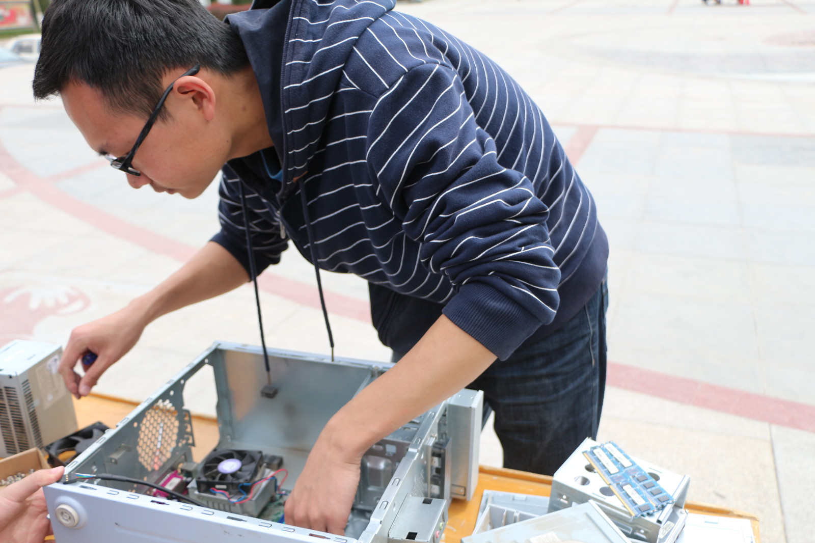 4月17日上午,由计算机科学协会举办的第二届电脑全能王大赛之拆装机比赛,在阳光苑广场顺利举办。电脑全能王大赛分为四个部分的比赛:PS比赛,编程比赛,PPT比赛以及拆装机比赛。作为此次全能王大赛的“重头戏”—拆装机比赛,旨在对电脑主机的实际拆装的情况下提高参赛选手对电脑主机内部构造的理解程度,激发选手兴趣,提高选手们的动手实践能力。