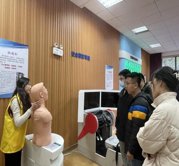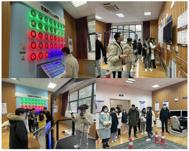 首先,体验室工作人员简单介绍了VR安全体验馆设备及场景,包括海姆立克急救训练方法、交通安全标识识别、汽车安全实训教学系统、模拟灭火实训教学系统、逃生急救结绳方法及醉酒行走体验等项目。随后,同学们在视频教学与工作人员的指导下积极体验各种安全教学项目。