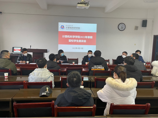 在报告厅召开2022年寒假留校学生座谈会,学院党委书记王耀明、党委副书记郭康凌,团委书记何文曦、辅导员蒋江红、田海东、陈坤正及肉漫画