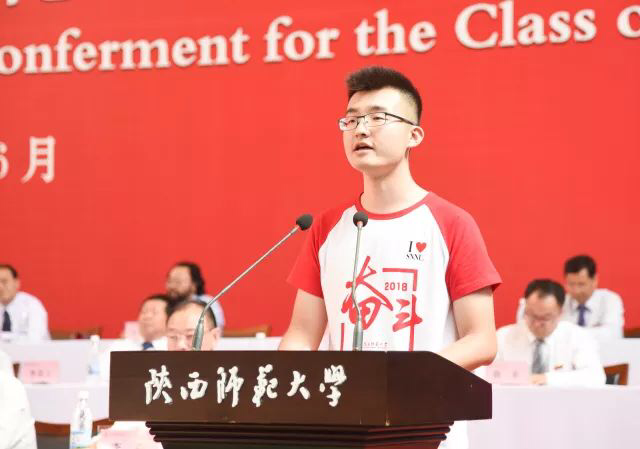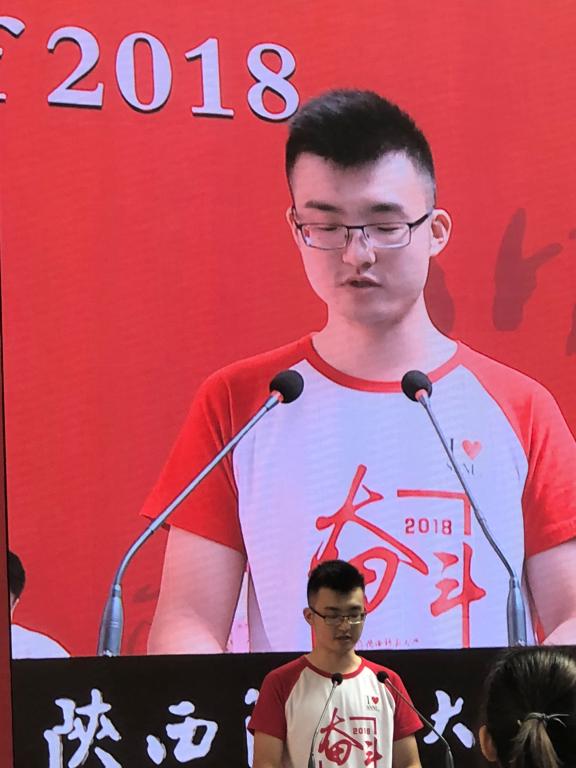 我是计算机科学学院2014级公费师范生李天宇。四年前,我们手持散发浓浓墨香的通知书,满怀憧憬地走进师大;四年来,我们无时无刻不感受着十三朝古都的厚重,体味着师大雁塔校区的古朴典雅、钟灵毓秀,长安校区的现代开放、气势恢宏。今天,我们即将带着“厚德、积学、励志、敦行”的校训精神离开母校,我们无悔自己当初的选择,更要感谢自己四年来的奋斗。